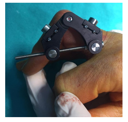 Schanz vidalarının parmağın üst düzleminden atılması ve bir paket lastiğinin zorlaması ile kontraktürü tedavi etmeye çalışan bir fiksatör.